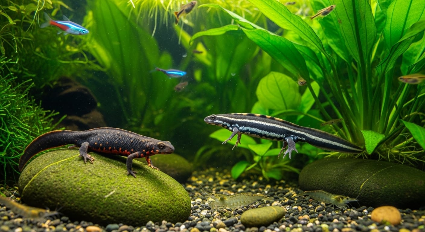 アカハライモリとシリケンイモリを同じ水槽で飼育する場合、成功するポイントは環境と導入方法にあります。