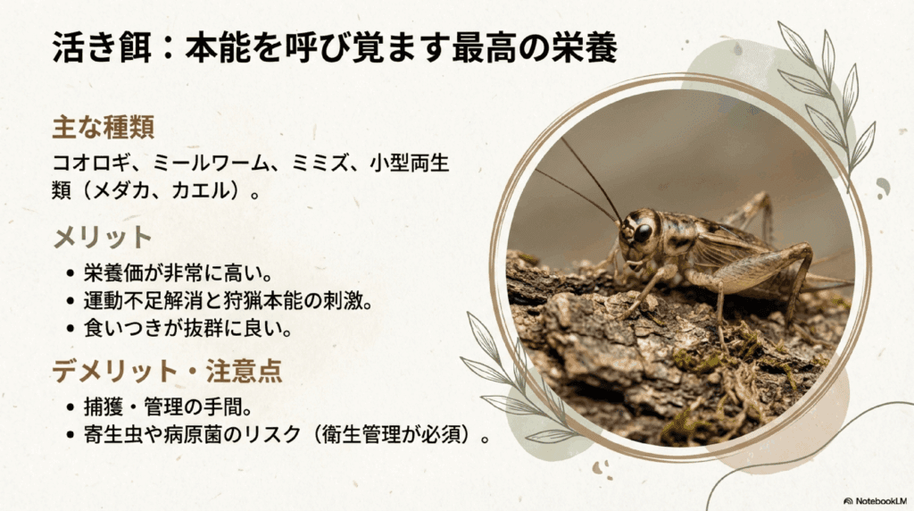 活き餌は、タイガーサラマンダーの最も自然な餌です。与えることで、運動や狩猟本能を刺激することができます。