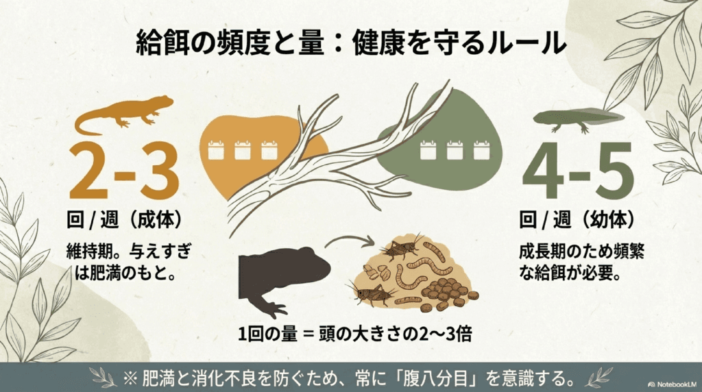 1回の餌の量は、タイガーサラマンダーの体長の2~3倍程度が目安です。餌を与えすぎると、消化不良や肥満の原因になるので注意が必要です。