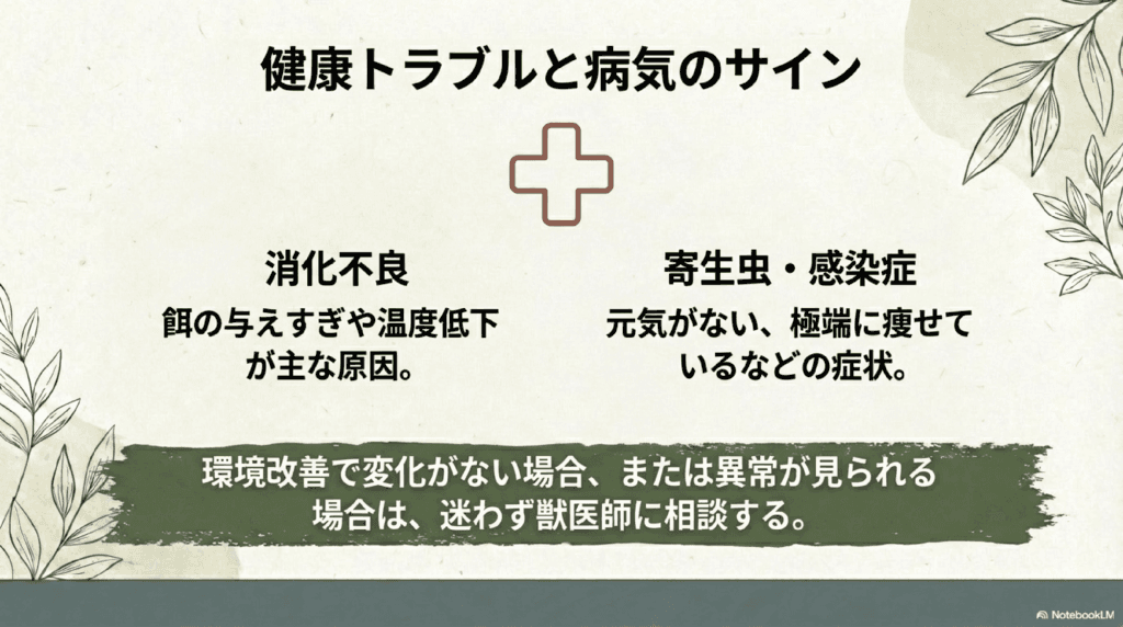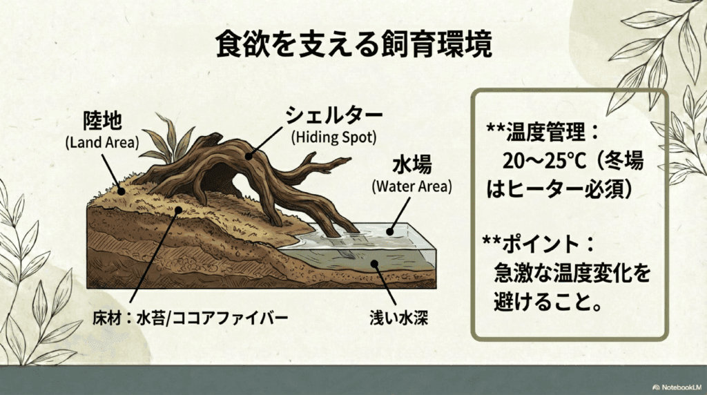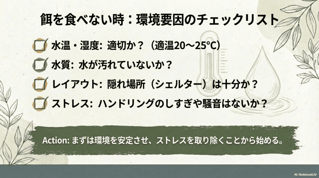 - 飼育環境: 水温や湿度、水質、隠れ場所などに注意する必要があります。