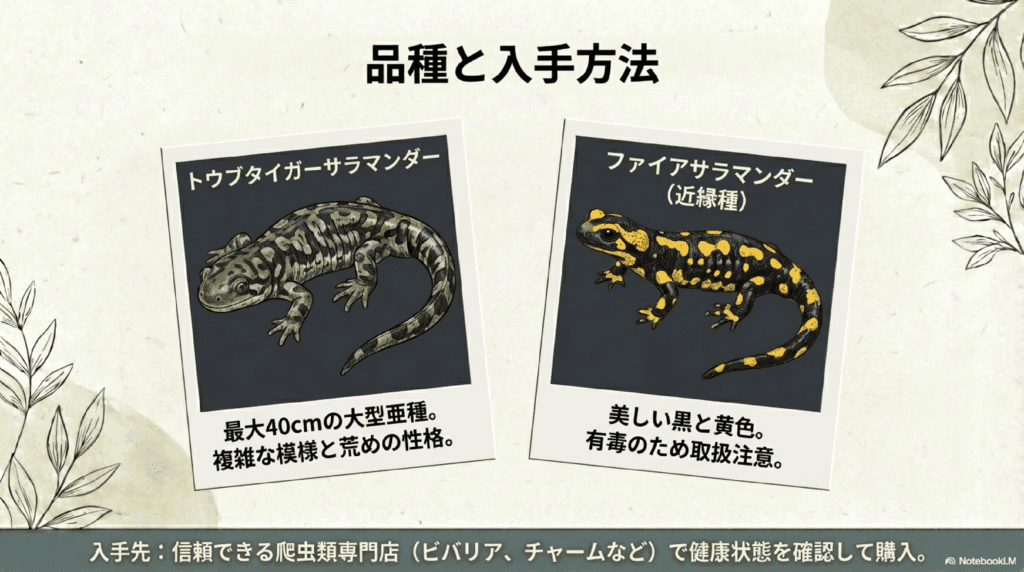 タイガーサラマンダーは、魅力的な両生類ですが、飼育にはある程度の知識と経験が必要です。飼育を検討する際は、十分な情報収集を行い、適切な飼育環境を用意しましょう。