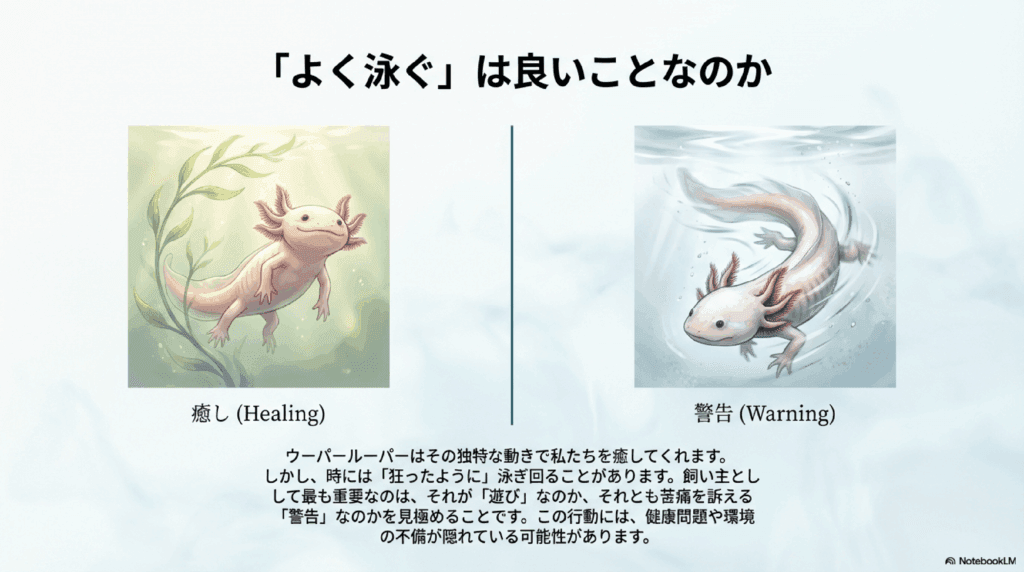 まず、ウーパールーパーが動き回ることは、彼らの自然な行動であり、好奇心や環境への適応の一部であることを理解しました。しかし、異常な泳ぎ方や落ち着きのなさ、壁にぶつかる行動などは、ストレスや病気の兆候である場合があります。これらの行動を注意深く観察し、適切な対応を取ることが大切です。