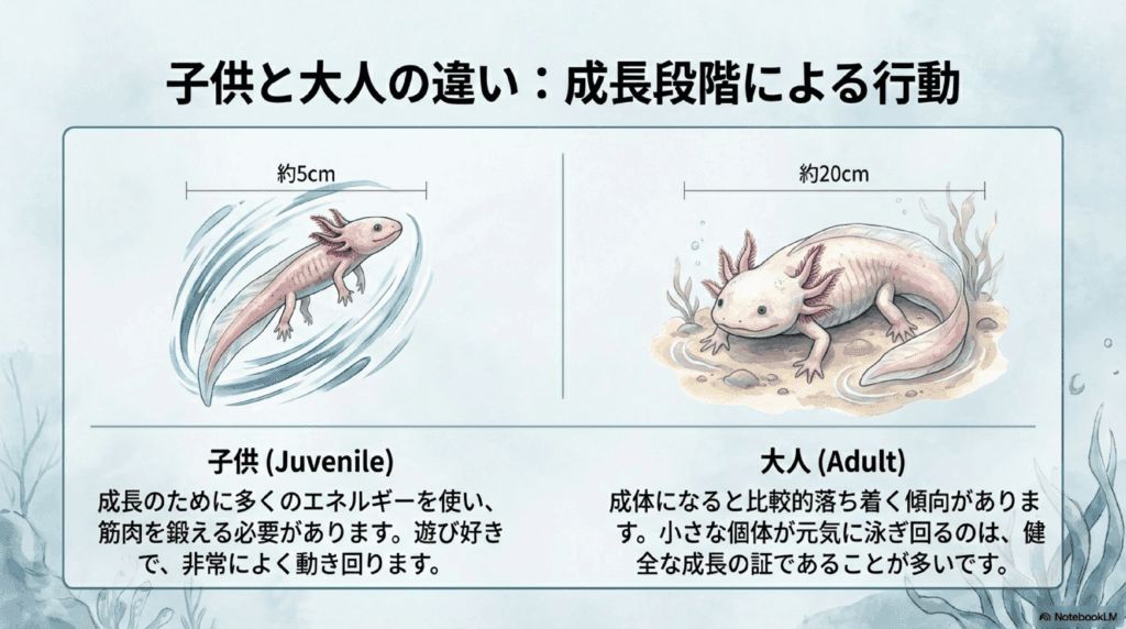 特に子供のウーパールーパーは、成長の過程で活発に泳ぎ回ることが一般的です。彼らは成長に伴い、運動能力を向上させるために多くのエネルギーを使います。子供のウーパールーパーは特に遊び好きで、他の個体と遊んだり、環境に興味を持ったりするために泳ぎ回ることが多いです。