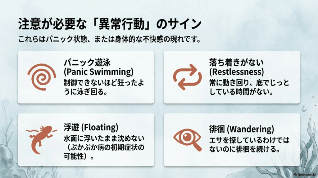 ウーパールーパーが動き回ることは自然な行動ですが、時には異常な行動を示すことがあります。特に、狂ったように泳いだり、落ち着きがなかったりする場合、何かしらの健康問題やストレスが関与していることが考えられます。このセクションでは、ウーパールーパーの異常行動の原因やそれに伴うサインについて探ります。
