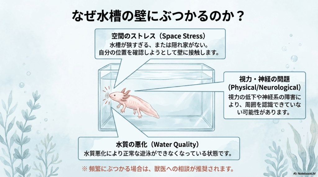 ウーパールーパーが壁にぶつかる主な理由の一つは、飼育環境の不適切さです。水槽が狭すぎたり、隠れ家や遊び場が不足していると、ウーパールーパーはストレスを感じ、行動が異常になることがあります。狭い空間では、彼らは自由に動き回ることができず、壁にぶつかることで自分の位置を確認しようとすることがあります。