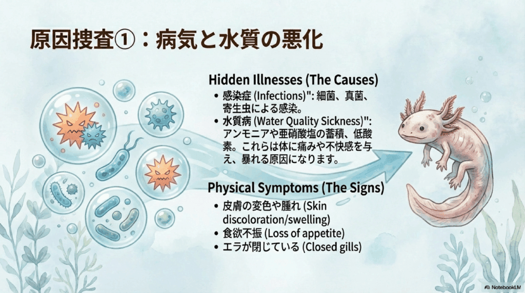 細菌や真菌、寄生虫による感染症は、ウーパールーパーの健康を脅かします。これらの感染症は、体調の変化を引き起こし、暴れたり、泳ぎ方が異常になったりする原因となります。