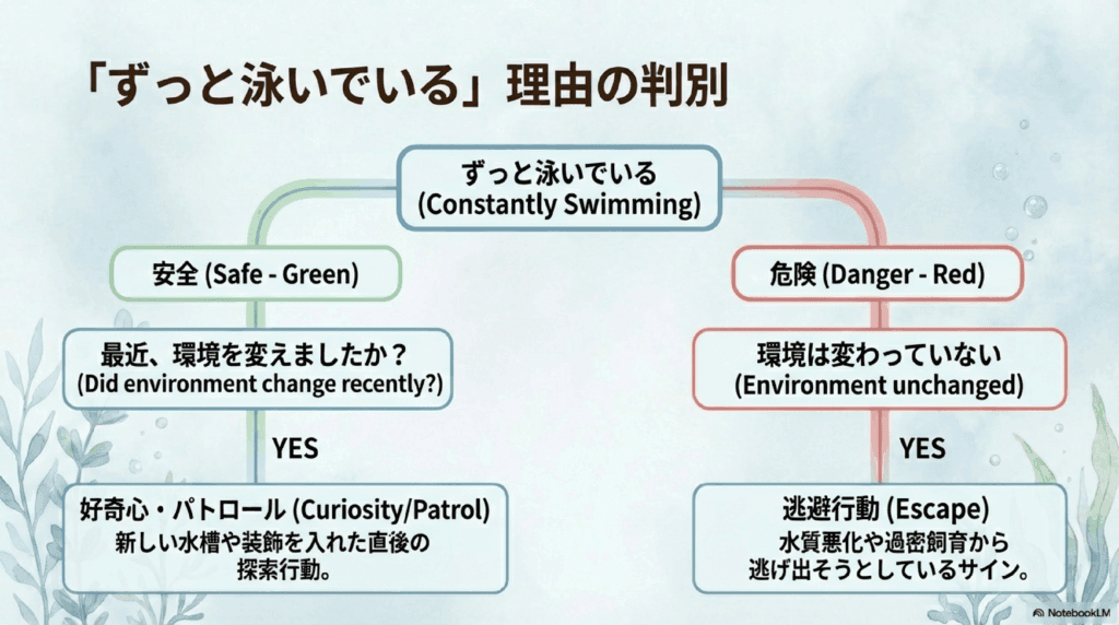 ウーパールーパーが長時間泳ぎ続ける理由の一つは、ストレスや不安によるものです。環境が適切でない場合や、他の生物との過密飼育、音や光などの刺激が強すぎる場合、彼らは安心できる場所を求めて泳ぎ回ることがあります。このような行動は、ストレスの発散方法の一つです。