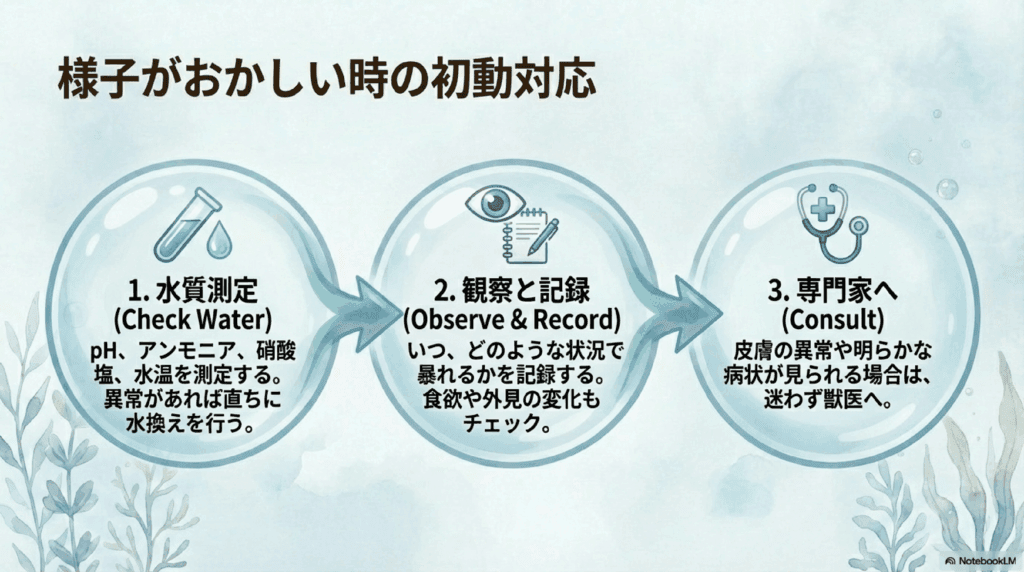 ウーパールーパーの様子がおかしい場合は、迅速な対応が重要です。まず、以下の手順を踏んで、彼らの健康状態を確認しましょう