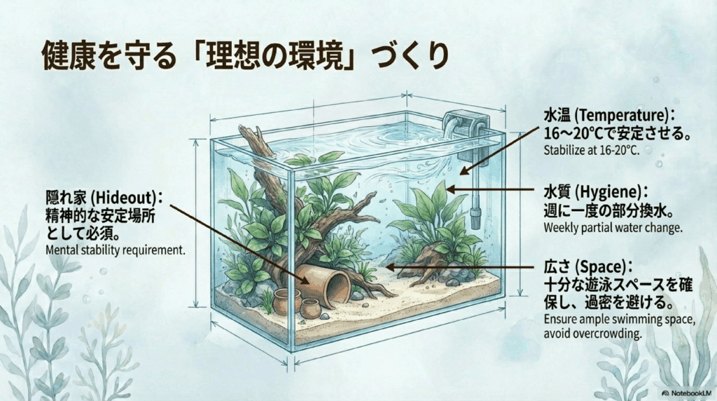 ウーパールーパーにとって快適な環境を整えることは、彼らの健康を守るために非常に重要です。以下のポイントに注意しましょう