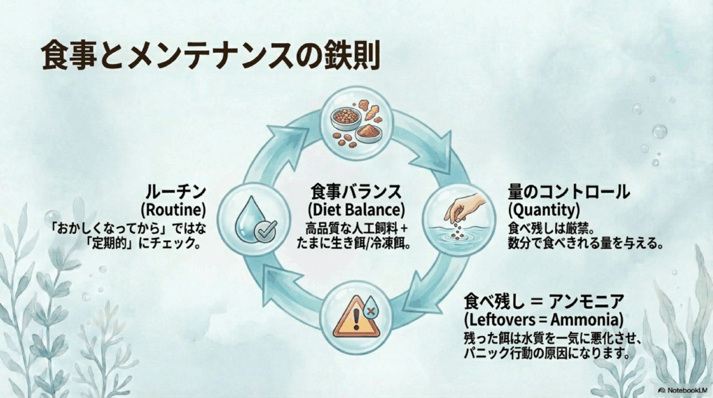 餌の与えすぎは水質の悪化を招くため、適切な量を見極めることが重要です。通常、彼らが数分で食べられる量を目安にしましょう。