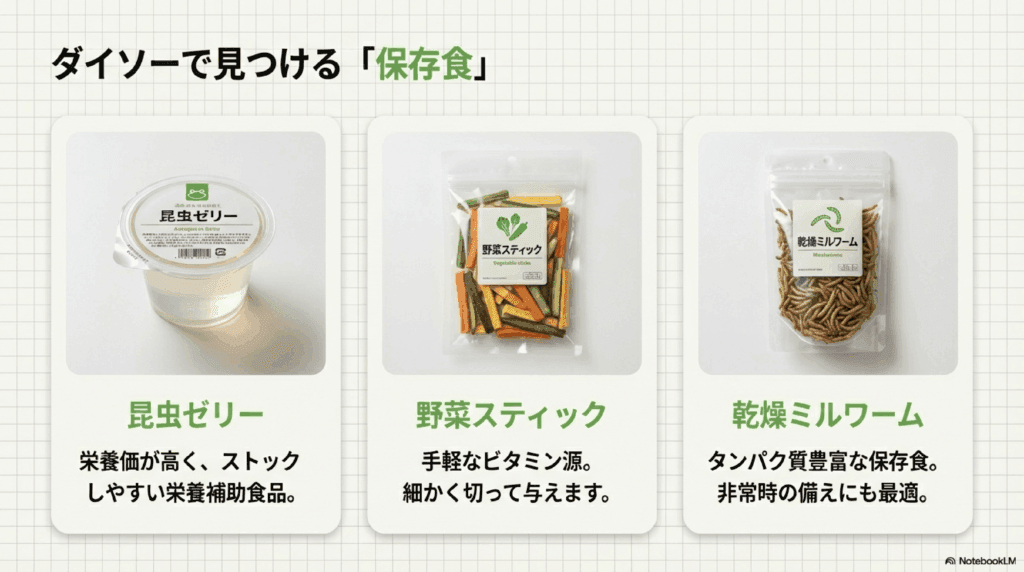 ダイソーや100円ショップでは、ペット用の食材が多く揃っています。アマガエルに適した餌も、手軽に購入することができます。以下は、ダイソーで手に入るおすすめの食材です。