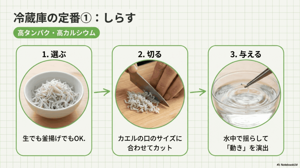 しらすを使った餌は、アマガエルの健康維持に役立つだけでなく、手軽に用意できるのが魅力です。