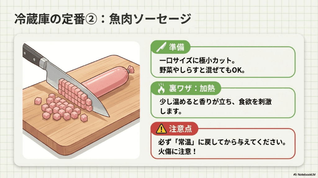 - 魚肉ソーセージ: 手軽に入手できる食品で、栄養価も高いですが、小さくカットして与えることが重要です。