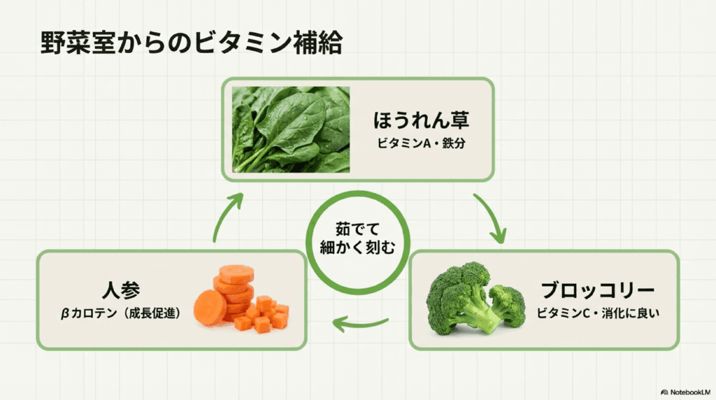 - 野菜スティック: 手軽に野菜を与えられるので、ビタミン補給に役立ちます。細かく切って与えましょう。