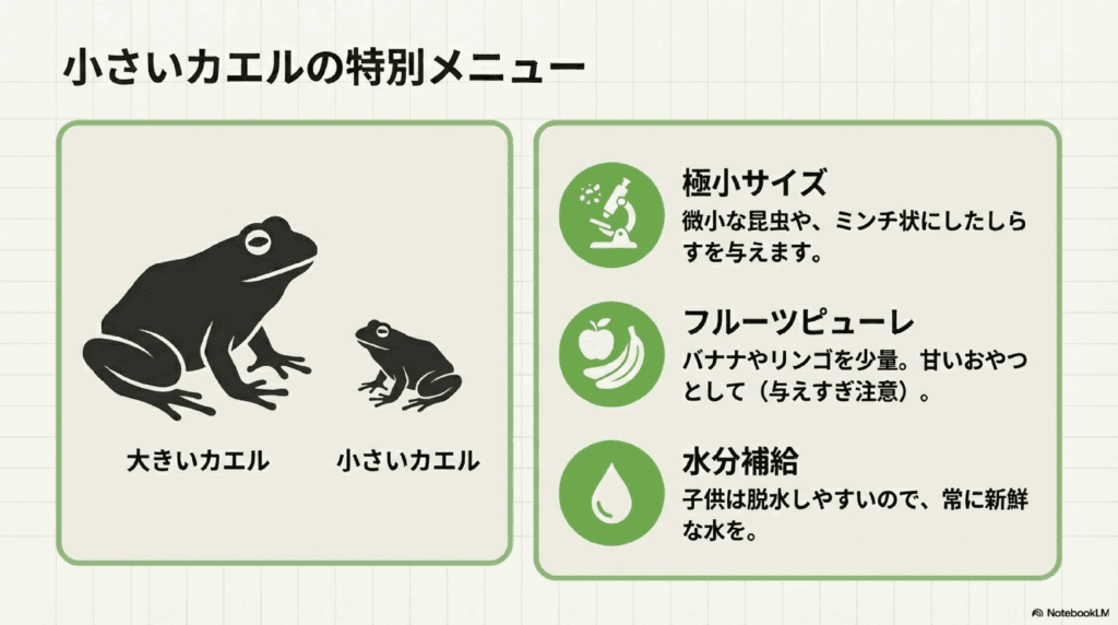 小さいアマガエルは、成長過程にあるため、特に注意が必要です。彼らは、適切な餌を与えないと健康を損なう可能性があります。このセクションでは、小さいカエルに対する餌の選び方や、特に注意すべきポイントについて詳しく解説します。