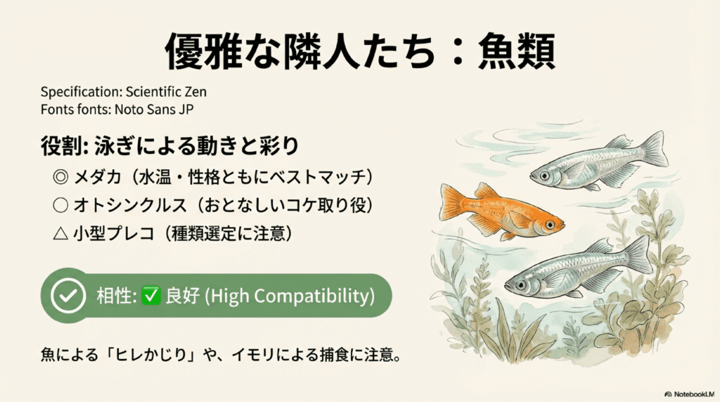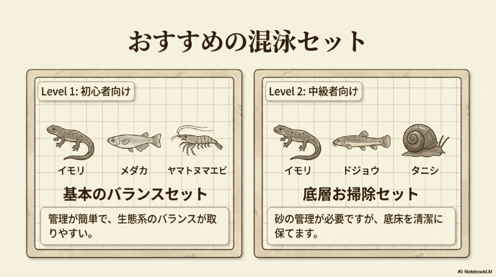 中級者向けには、少し手間がかかるものの、よりバリエーション豊かな生物との混泳を楽しめる組み合わせを紹介します。