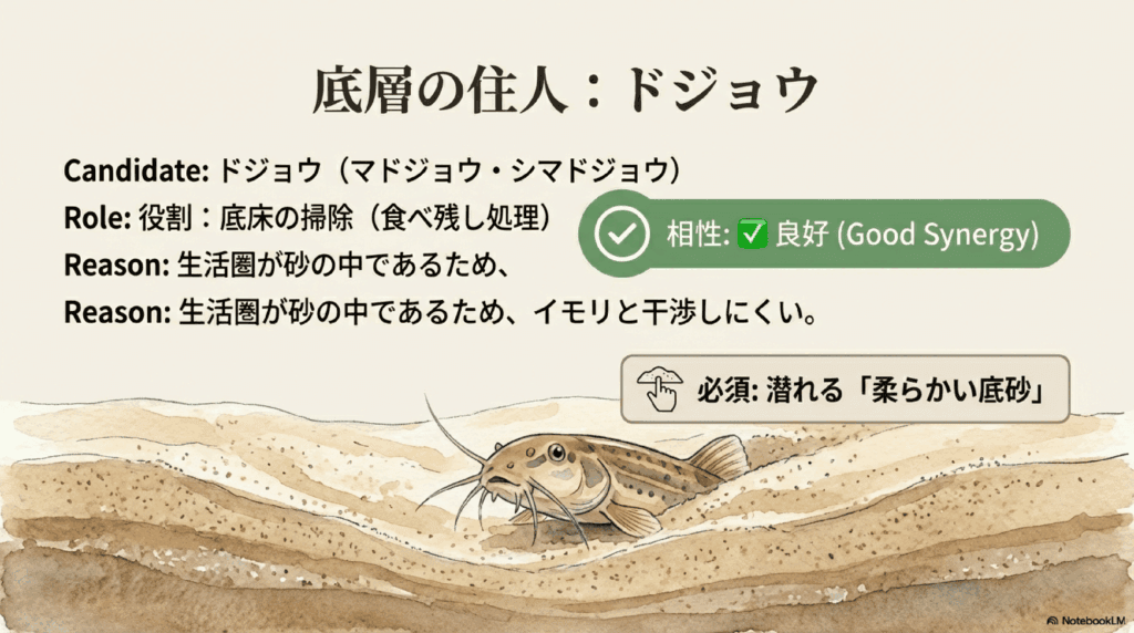 ドジョウはアカハライモリと同じように温和な性質を持ち、砂地の底層を中心に活動するため、アカハライモリと縄張りが重なりにくいです。また、ドジョウは残り餌を掃除する働きも期待でき、水槽の清潔さを保つ手助けとなります。