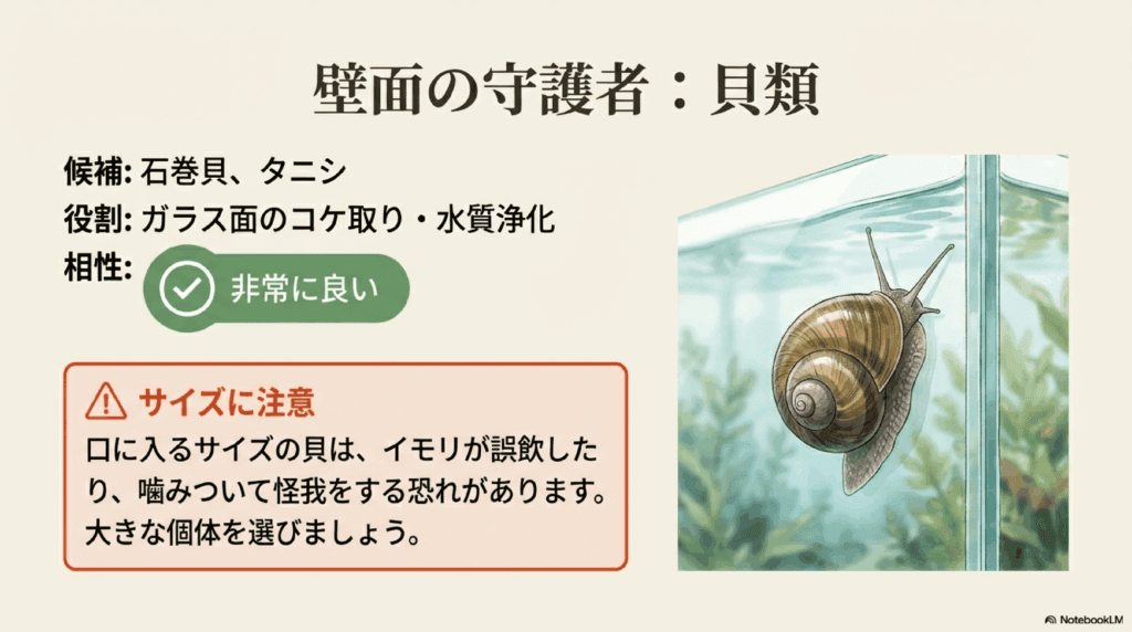 石巻貝やタニシなどは、アカハライモリの水槽に適しています。これらの貝は水質の改善に役立ち、コケの掃除もしてくれるため、水槽内の清潔を保つサポートになります。