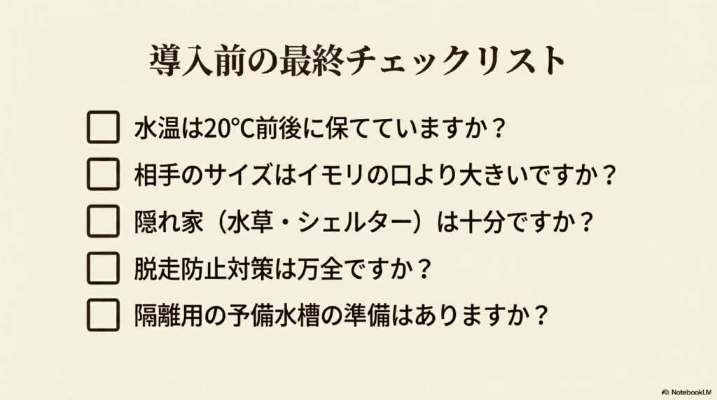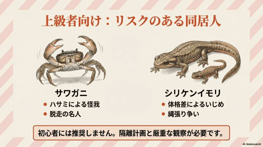 アカハライモリと混泳できる生き物を選ぶ際には、次のポイントに注意しましょう: