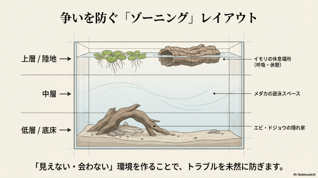 水草や流木、シェルターなどを配置し、生物ごとに隠れ場所を作ることが大切です。アカハライモリには水面近くに浮かべた水草や石の配置が適しており、エビやドジョウには水槽の底層に隠れられる小さなシェルターが適しています。これにより、各生物が安心して過ごせる空間ができ、争いの発生が抑えられます。