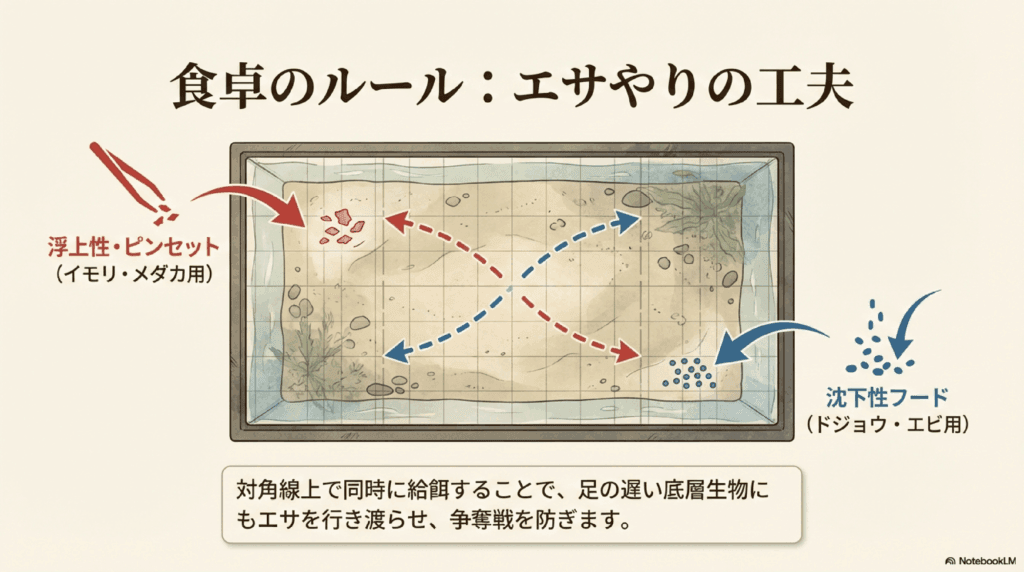 混泳生物同士でエサの奪い合いが起こらないよう、エサを複数の場所に配置するか、少しずつ与えることで、各生物が十分に食事できるようにしましょう。また、食べ残しは水質悪化の原因となるため、与える量には注意が必要です。