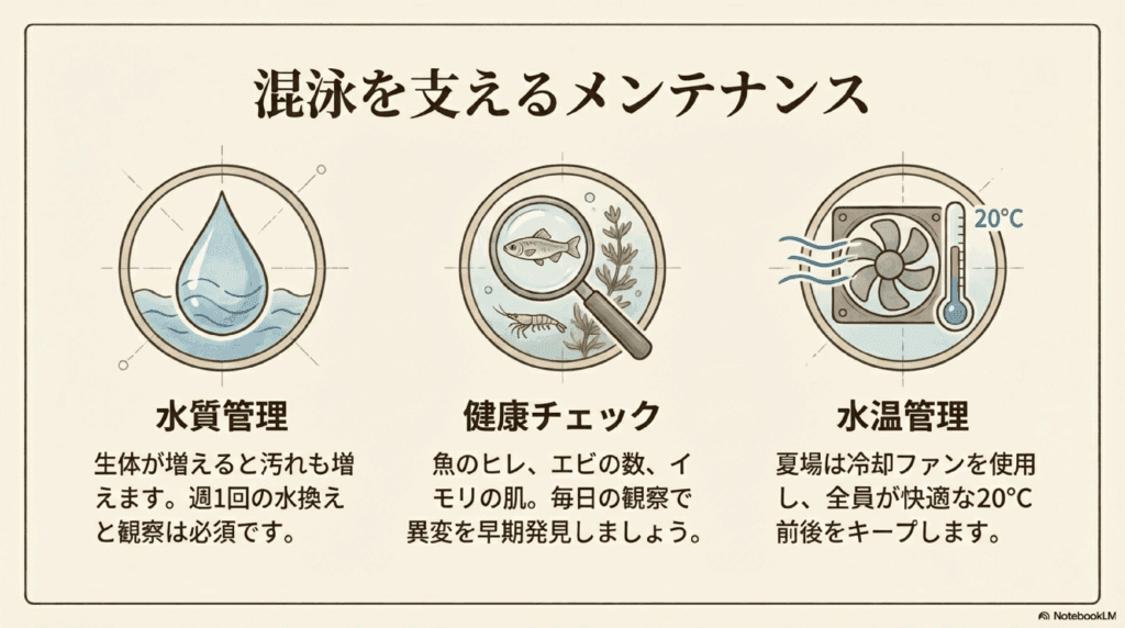 混泳環境を維持するためには、定期的なメンテナンスと各生物の健康管理が欠かせません。水質や水温の管理、掃除をこまめに行うことで、生物たちの健康を守ることができます。