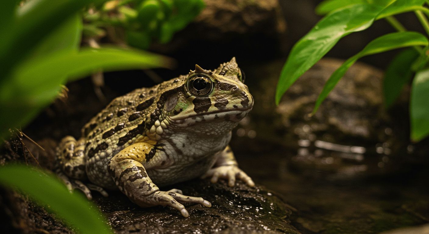 ツノガエルは紫外線を浴びることでビタミンDを合成し、カルシウムの吸収を助けます。しかし、過度な紫外線や直射日光は目に負担をかけるため、適切な強度のUVBライトを使用し、長時間の直射を避けるようにしましょう。