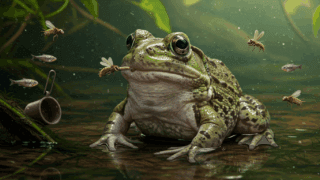 クランウェルツノガエルは、体長が最大で約15cmにも達し、丸い体型と大きな口を持つことから「フロッグ・モンスター」とも呼ばれることがあります。その特徴的な顔つきと緑色や茶色の斑点模様は、自然環境でのカモフラージュに役立っています。普段は木の葉や地面に隠れて、獲物を待ち伏せて捕食します。
