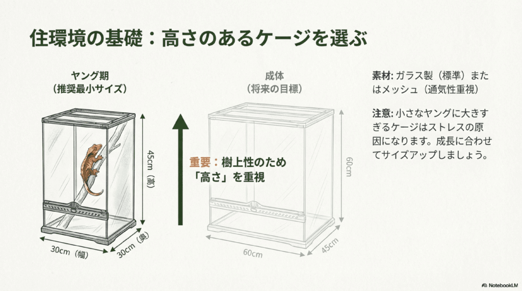クレステッドゲッコー ヤングが健やかに成長するためには、適切なケージと飼育環境を整えることが非常に重要です。ヤングの時期は特に敏感で、環境が整っていないとストレスを感じたり、健康を害したりすることがあります。このセクションでは、クレステッドゲッコー ヤングのためのケージ選びや環境作りのポイントについて詳しく説明します。