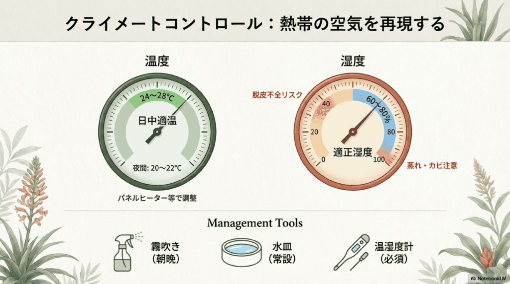 湿度は60〜80%程度が最適です。湿度が低いと脱皮不良を起こしやすく、健康に影響を及ぼすことがあります。湿度を保つために、ケージ内に霧吹きで水をかけたり、湿度を調整できるシステムを導入したりするのが効果的です。湿度計を使って、環境が常に最適であるか確認しましょう。