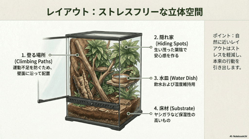 クレステッドゲッコー ヤングは、樹上性の動物であり、自然な環境に近いレイアウトが望ましいです。ケージ内にいくつかの登る場所を作ることで、クレステッドゲッコーはより自然に活動でき、ストレスが軽減されます。