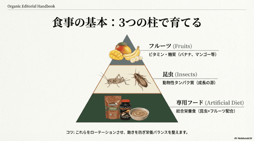 与える餌は新鮮であることが大切です。特にフルーツや昆虫は腐りやすいため、食べ残しがないか確認し、必要であればすぐに取り替えます。