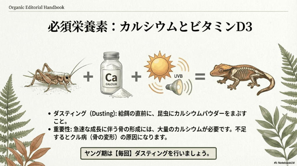 ヤングのクレステッドゲッコーは骨の成長が盛んなため、カルシウムを補うことが重要です。昆虫にカルシウムパウダーを振りかけて与えることが推奨されます。特に、UVBライトを使っていない場合、カルシウム不足になりやすいので意識的に補うようにしましょう。