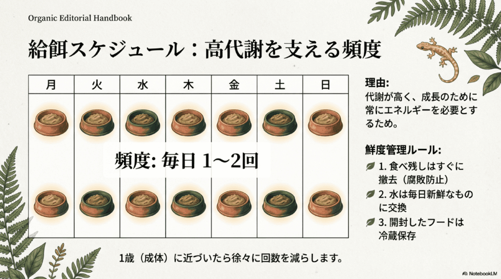 ヤングのクレステッドゲッコーは急成長するため、餌を頻繁に与える必要があります。1日1回、または場合によっては2回程度与えるのが理想です。食べ残しがある場合は翌日新しい餌に交換しましょう。