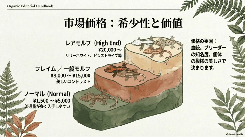 クレステッドゲッコー ヤングの価格は、主にモルフの種類や血統、さらに個体の健康状態に基づいて決まります。一般的に、標準的なノーマルモルフは最も安価で、特殊なモルフは高価になります。