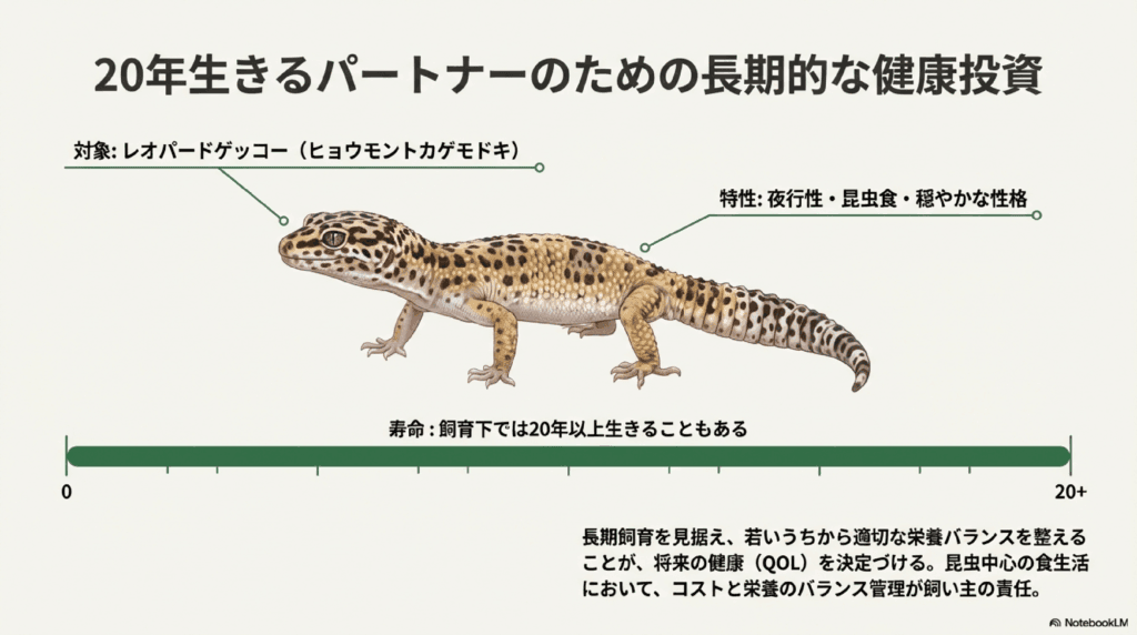レオパードゲッコーは20年以上生きる個体もいるため、長期的な飼育を見据えた準備が必要です。健康な成長をサポートするためには、適切な栄養バランスを考えた餌やりが欠かせません。