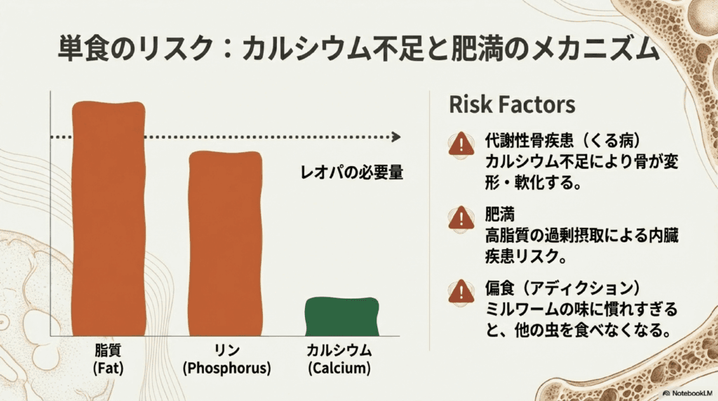 ミルワームは栄養価が高い餌ですが、「ミルワームだけを与える」のはおすすめできません。その理由は、栄養バランスが偏る可能性が高いためです。ミルワームは脂質が多く、カルシウムが少ないため、長期間与え続けると以下の問題が起こるリスクがあります