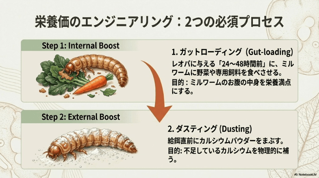 一方で、単体で与えるだけではカルシウムや他のビタミンが不足しがちです。そのため、与える際にはカルシウムパウダーをまぶしたり、ミルワーム自体に野菜などを与えて栄養価を高める「ガットローディング」が推奨されます。
