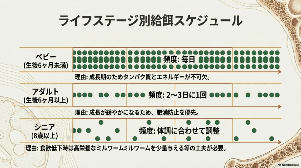レオパードゲッコーにミルワームを与える頻度は、年齢や健康状態によって異なります。以下のガイドラインを参考にしてください