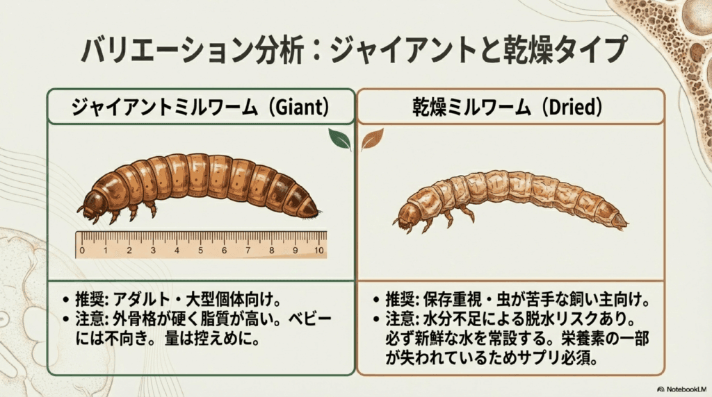 ジャイアントミルワームは、通常のミルワームよりも大きく、より多くの栄養を含む餌として知られています。しかし、その大きさゆえに与える際にはいくつかの注意点があります