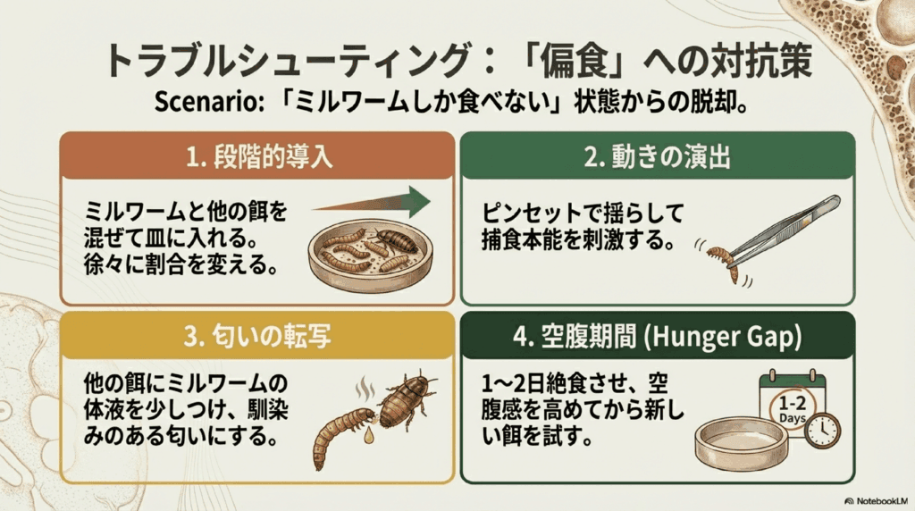 - 偏食:ミルワームの食感や動きに慣れてしまうと、他の餌を拒否する偏食傾向が強まります。