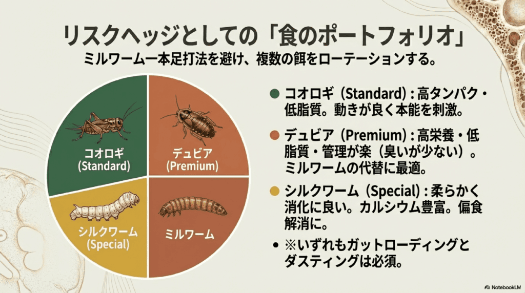 - 与えるポイント:適切な頻度や量を守り、ガットローディングやカルシウムパウダーの使用で栄養バランスを補強しましょう。