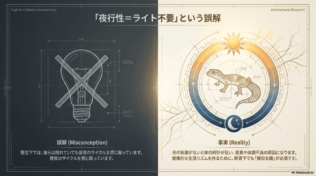 レオパードゲッコーは夜行性ですが、昼間は休息している間も光の周期(昼夜のサイクル)を感じることが重要です。これにより、体内時計が整い、適切な休息と活動のタイミングを持つことができます。