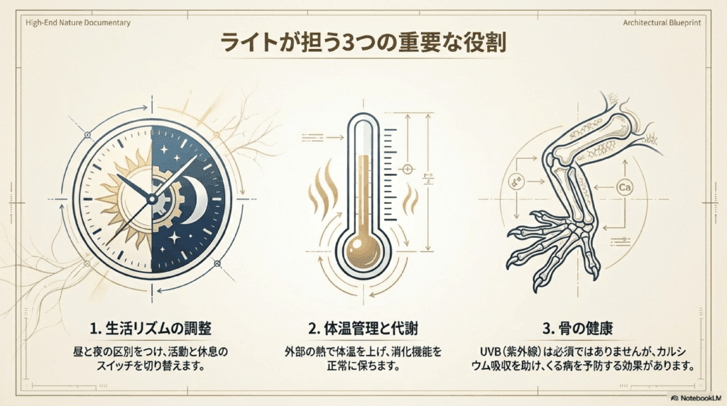 ライトがレオパードゲッコーの健康に与える影響は大きいです。特に以下の点が重要です。