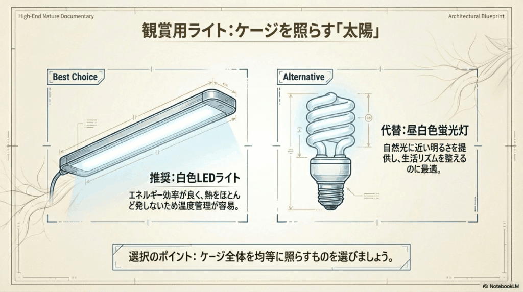 観賞用ライトを選ぶ際は、ケージ全体を均等に照らすタイプを選ぶことが大切です。強すぎず、弱すぎない適切な明るさを選びましょう。