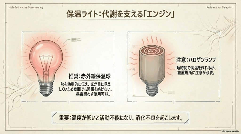 さらに、保温球の選び方にも注意が必要です。赤外線保温球やクリア保温球、ハロゲンランプなど、それぞれの特徴に応じて使い分け、設置時は温度が過剰にならないように適切な高さや距離を保つことが大切です。