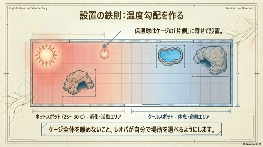 保温球はケージの一部に設置することで、温かいエリアを作ります。理想的には、ケージの片側に設置し、レオパードゲッコーが自由に温かい場所と涼しい場所を行き来できるようにしましょう。これにより、レオパードゲッコーは自分で温度を調整し、より自然に近い環境で過ごすことができます。
