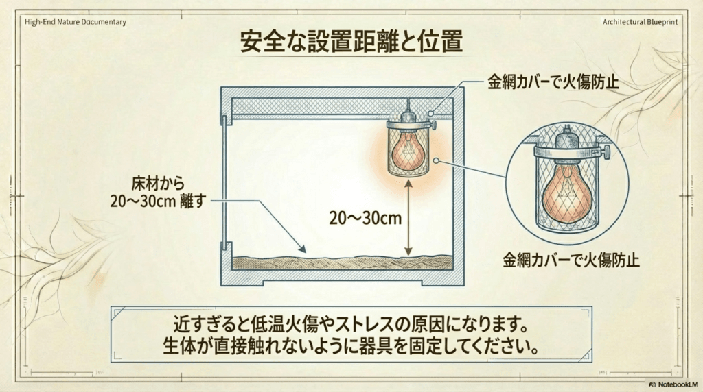 保温ライトを設置する際には、温度が過剰にならないように細心の注意を払う必要があります。レオパードゲッコーは過度の熱に弱いため、適切な温度範囲を保つことが大切です。
