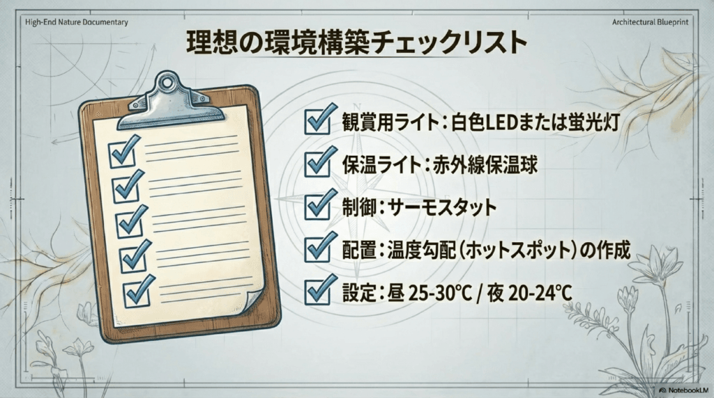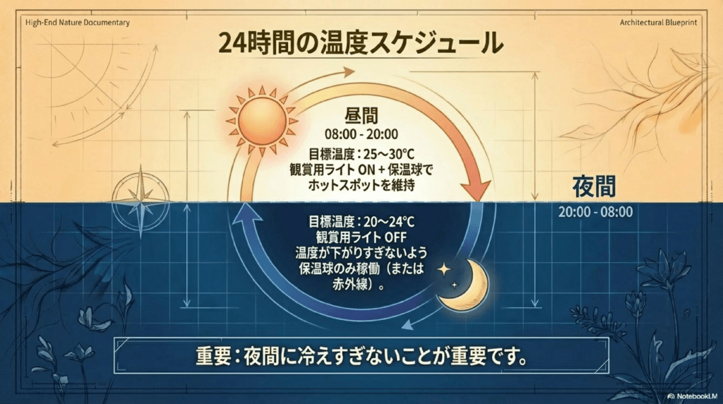 夜間は自然環境に合わせて、温度が少し下がるように調整します。夜間の温度は20〜24℃が目安です。過度に冷えすぎることがないように、LEDライトや低温の保温ライトを使うことで温度が安定します。