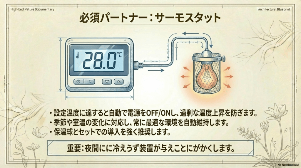 温度管理を確実に行うためには、サーモスタットを使用するのが最適です。サーモスタットを使うことで、設定した温度にライトを自動的に調整でき、温度の急激な変化を防げます。